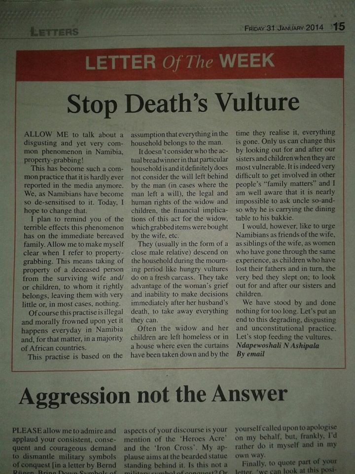 I would however, like to call upon the Namibian people as friends of the wife, as siblings of the wife, as women who have gone through the same experience, as children who have lost their fathers and in turn, the very bed they slept on; look out for and after our sisters and children. We have stood by and done nothing for too long. Let’s put an end to this degrading, disgusting and unconstitutional practice. Let’s stop feeding the vultures.